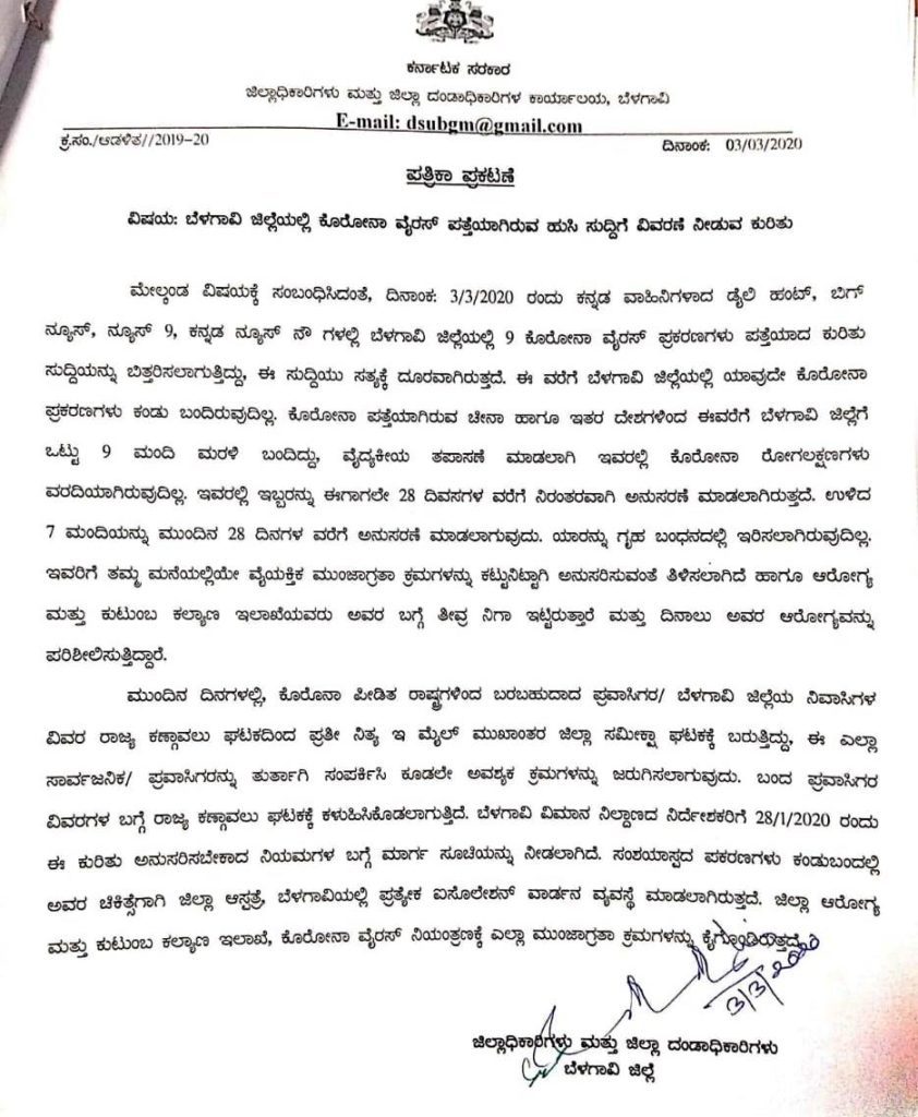 ಕರೋನ ಸುಳ್ಳು ಸುದ್ದಿ ಬಗ್ಗೆ ಬೆಳಗಾವಿ ಜಿಲ್ಲಾಧಿಕಾರಿ ಪ್ರಕಟಣೆ