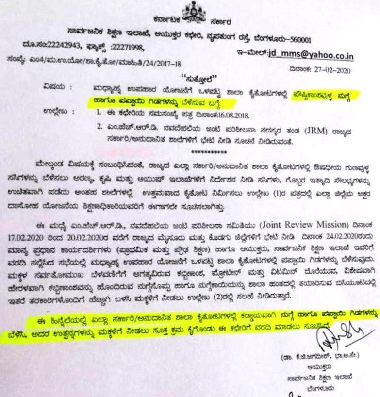 ಅದರಂತೆ ಮಕ್ಕಳ ಸರ್ವತೋಮುಖ ಅಭಿವೃದ್ಧಿಗಾಗಿ ಶಾಲೆಗಳ ಕೈ ತೋಟಗಳಲ್ಲಿ ನುಗ್ಗೆ, ಪಪ್ಪಾಯ ಗಿಡಗಳನ್ನು ಬೆಳೆಸಬೇಕು ಮತ್ತು ಅದನ್ನು ಬಿಸಿಯೂಟದಲ್ಲಿ ಇತರ ತರಕಾರಿಗಳ ಜತೆ ಬಳಸಬೇಕು. ಆ ಬಗ್ಗೆ ಕ್ರಮ ಕೈಗೊಂಡ ಬಗ್ಗೆ ವರದಿ ನೀಡಬೇಕು ಎಂದು ಶಿಕ್ಷಣ ಇಲಾಖೆ ಸುತ್ತೋಲೆ ಹೊರಡಿಸಿದೆ.