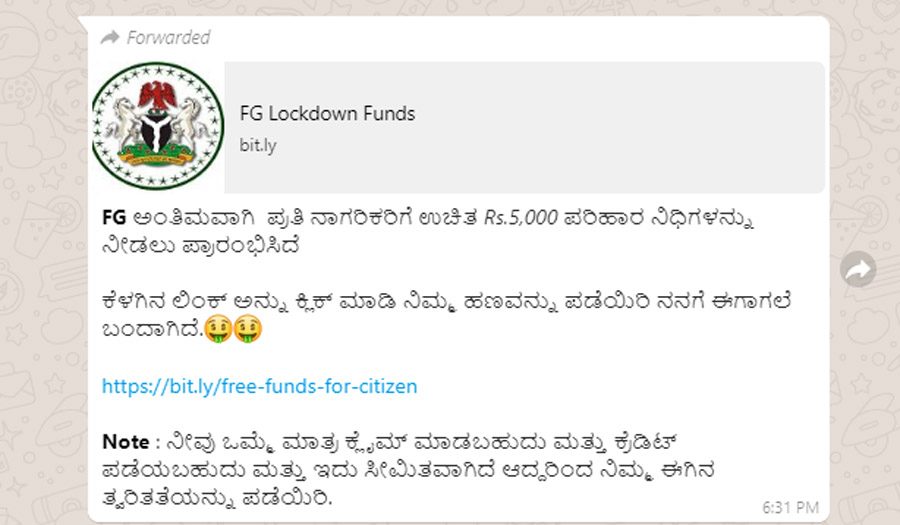 4. ಅಲ್ಲದೆ, ಕೇಂದ್ರ ಅಥವಾ ರಾಜ್ಯ ಸರಕಾರದ ವೆಬ್ ಸೈಟ್ ಗಳು .nic.in ಅಥವಾ .gov.in ವಿಳಾಸ ಹೊಂದಿರುತ್ತದೆ. ಅಲ್ಲದೆ, ಆ ಎಲ್ಲ ವೈಬ್ ಸೈಟ್ ಗಳು ಭದ್ರತೆ ಹೊಂದಿರುತ್ತದೆ. ಹರಿದಾಡುತ್ತಿರುವ ಲಿಂಕ್ ನ ವೆಬ್ ಸೈಟ್ http://fund.ramaphosafoundations.com/ ಎಂಬ ವಿಳಾಸ ಹೊಂದಿದೆ.