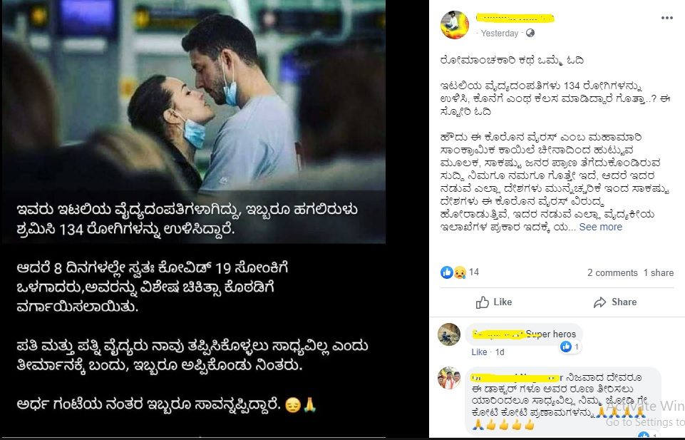 ಫೇಸ್ ಬುಕ್, ವಾಟ್ಸ್ ಆ್ಯಪ್ ಗಳಲ್ಲಿ ಹರಿದಾಡುತ್ತಿರುವ ಈ ಹಸಿ ಸುಳ್ಳಿನ ಕತೆ ಇಲ್ಲಿದೆ. ಇಟಲಿಯಲ್ಲಿ COVID-19 ರೋಗಿಗಳಿಗೆ ಚಿಕಿತ್ಸೆ ನೀಡುವಾಗ ವೈದ್ಯ ದಂಪತಿ ಕೊರೊನಾ ಸೋಂಕಿನಿಂದ ಮೃತಪಟ್ಟಿದ್ದಾರೆ ಎಂಬ ಸುಳ್ಳು ಸುದ್ದಿ ಎಲ್ಲೆಡೆ ಹರಿದಾಡುತ್ತಿದೆ.