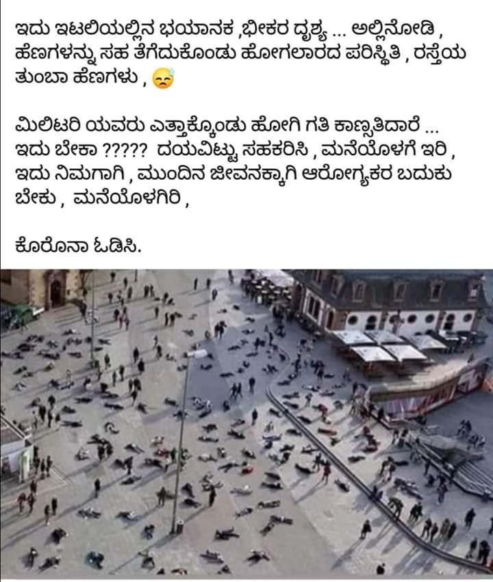 ಆರಿಸಲಾಗಷ್ಟು ಶವಗಳು ಇಟಲಿಯ ಖಾಲಿ ಪ್ರದೇಶದಲ್ಲಿ ಬಿದ್ದಿವೆ ಎನ್ನುವ ಫೋಟೊವೊಂದು ಹರಿದಾಡುತ್ತಿದೆ. ರಸ್ತೆ ಬದಿಯಲ್ಲಿ ಕಸದ ರೀತಿಯಲ್ಲಿ ಹೆಣಗಳು ಬಿದ್ದಿವೆ ಎಂದು ಫೋಟೊವನ್ನು ಫೇಸ್ ಬುಕ್, ವಾಟ್ಸಾಪ್ ಗಳಲ್ಲಿ ಫಾರವರ್ಡ್ ಮಾಡಲಾಗುತ್ತಿದೆ.